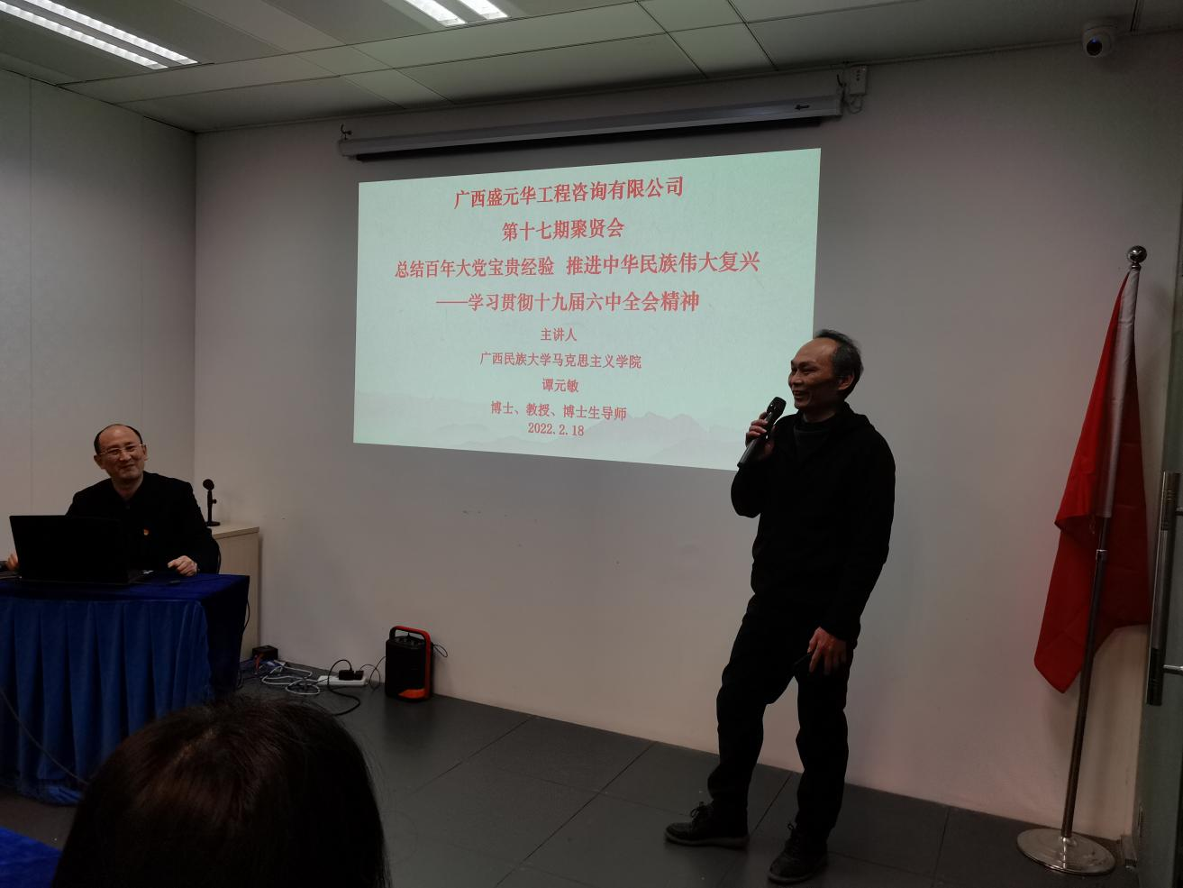 為豐富公司的黨建工作及企業(yè)文化建設(shè),公司于2月18日下午在總部會(huì)議室成功舉辦了第十七期期“聚賢會(huì)”互動(dòng)交流講堂活動(dòng)。本次“聚賢會(huì)”是以黨課的形式開展學(xué)習(xí)十九屆六中全會(huì)精神的講堂活動(dòng),主題為“總結(jié)百年大黨寶貴經(jīng)驗(yàn)、推進(jìn)中華民族偉大復(fù)興,解讀十九屆六中全會(huì)精神”。 本期活動(dòng)邀請(qǐng)到的是廣西民族大學(xué)譚元敏教授蒞臨我公司授課,他用生動(dòng)的語言、精彩的PPT演示,使“聚友”們對(duì)黨的十九屆六中全會(huì)精神有了更深刻的理解。